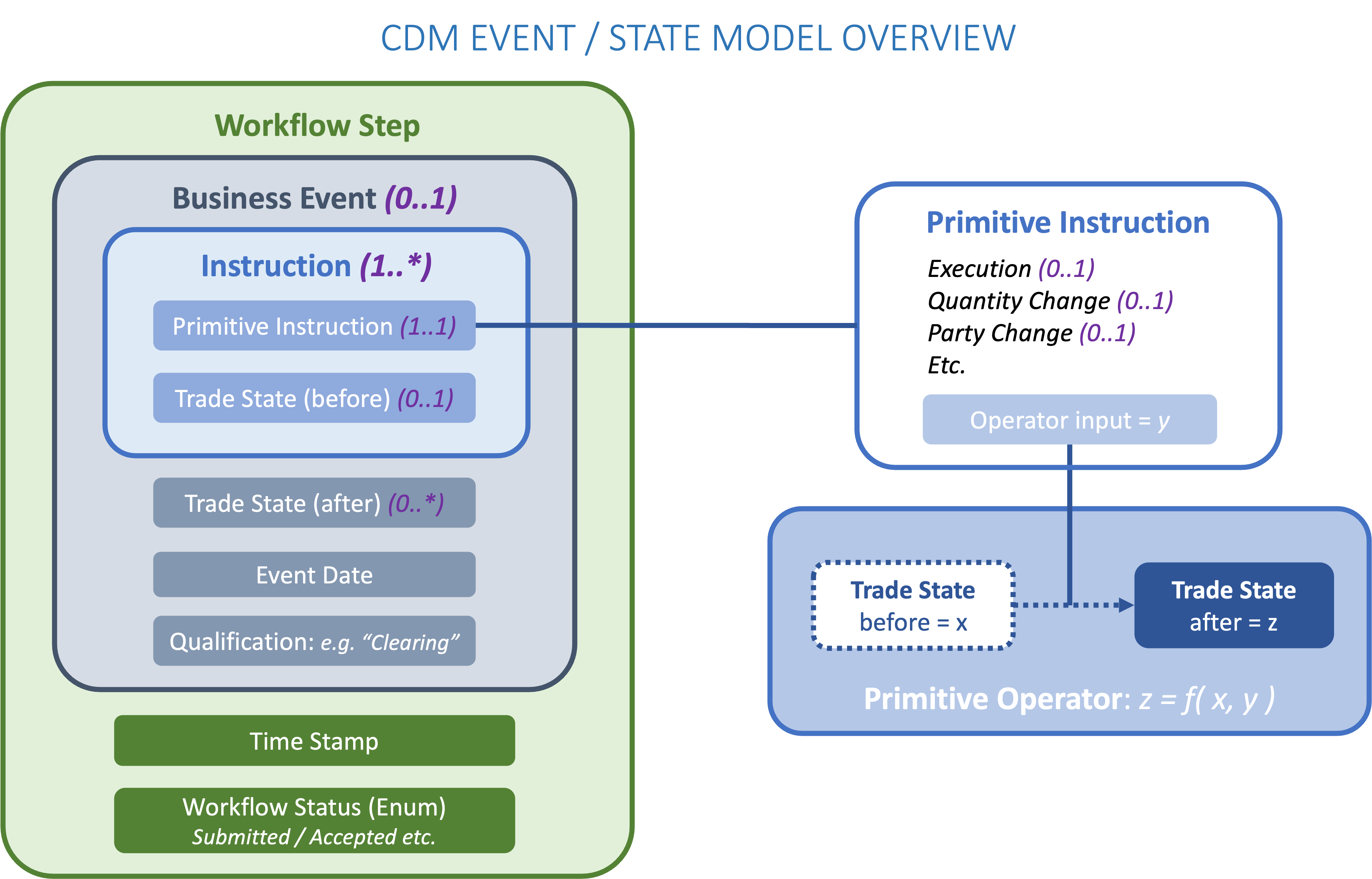 • State transitions are functional and composable. The CDM specifies the entire functional logic to transition from one state to another. The state transition logic of all in-scope events is obtained by composition from a small set of functional building blocks.